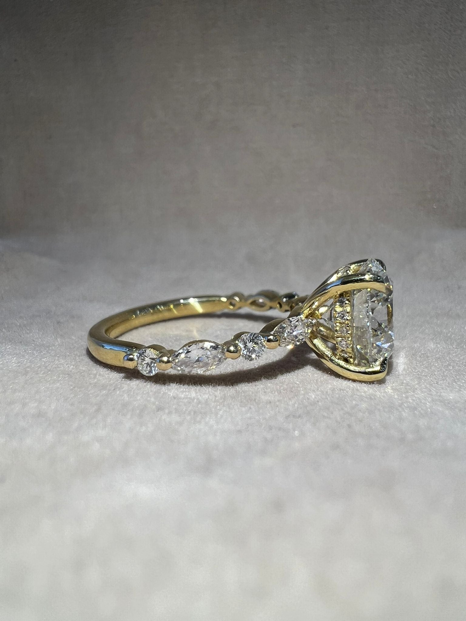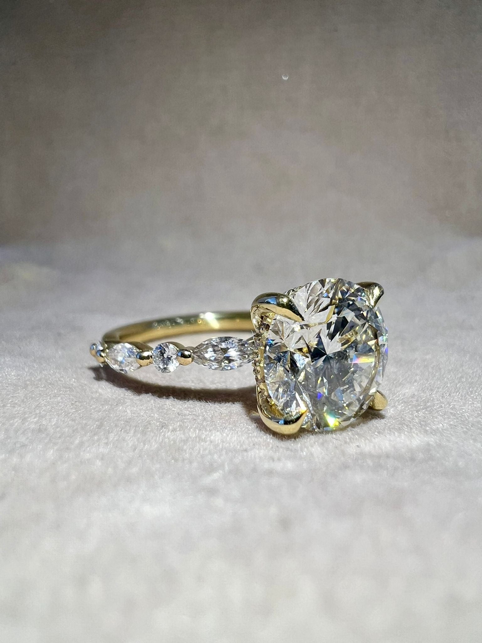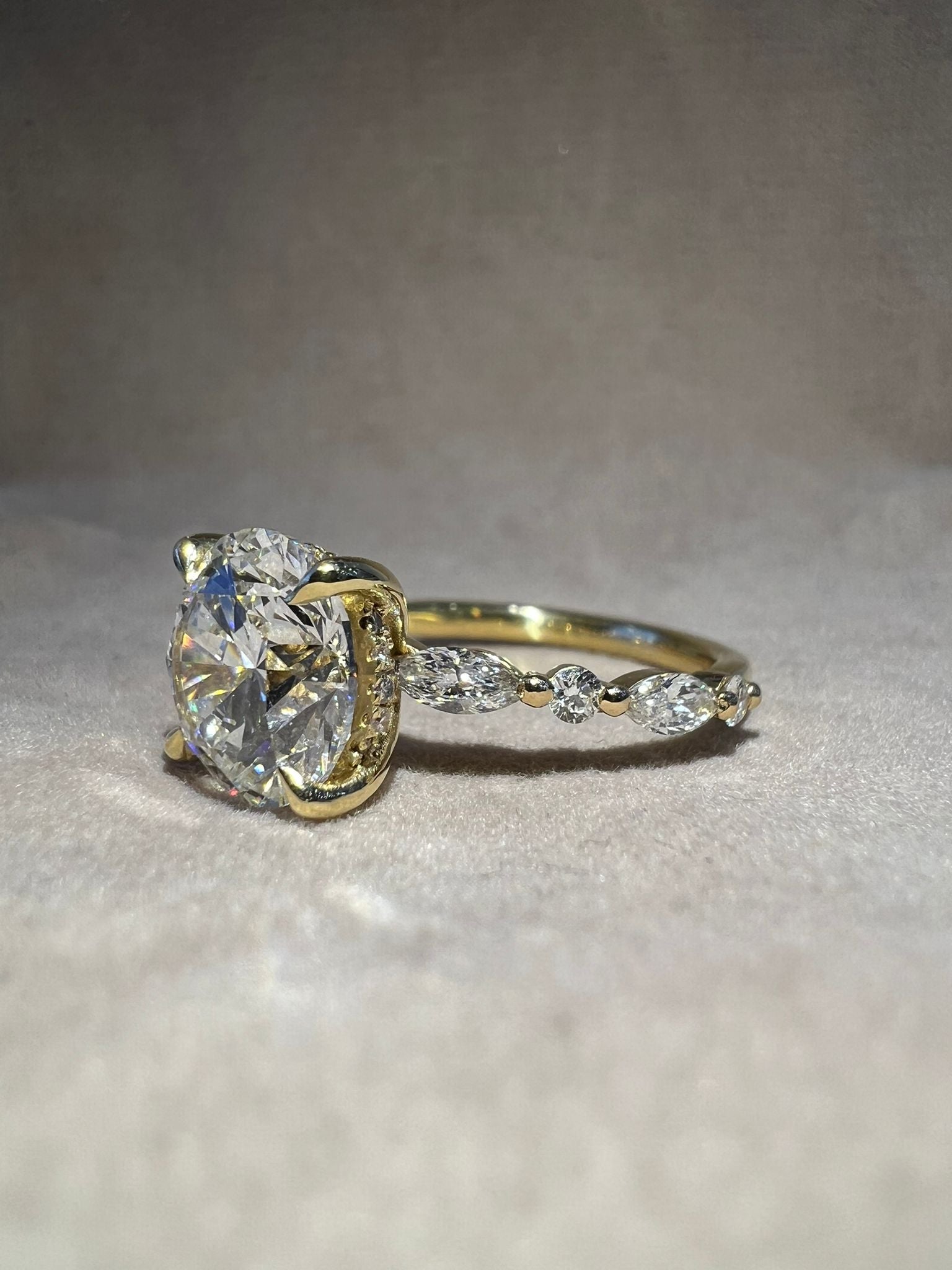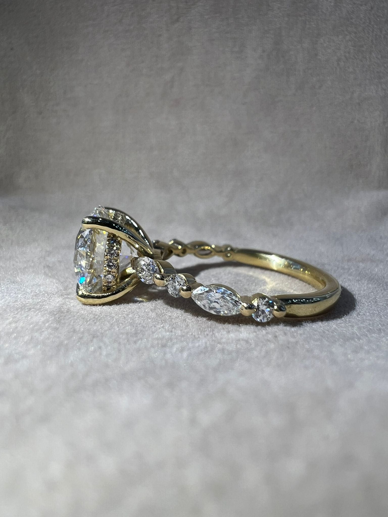 18ct Yellow Gold Lab Grown Diamond Ring For Sale, Featuring Marquise & Round Diamonds on The Band