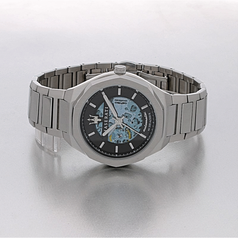 Presenting the Maserati Stile Open Heart Automatic Watch. Welcome to the Maserati Stile Collection: watches that take up the mechanics, construction and stylistic codes of the iconic sporting watchmaking timepieces. The decisive lines, the distinctive decagonal bezel and the slim case are combined with details that strongly identify the sporting world such as: pump pushers, screw-down crown, multi-level dial, applied luminescent indexes, luminescent hands and a buckle with a personalised butterfly clasp featuring the applied Trident.